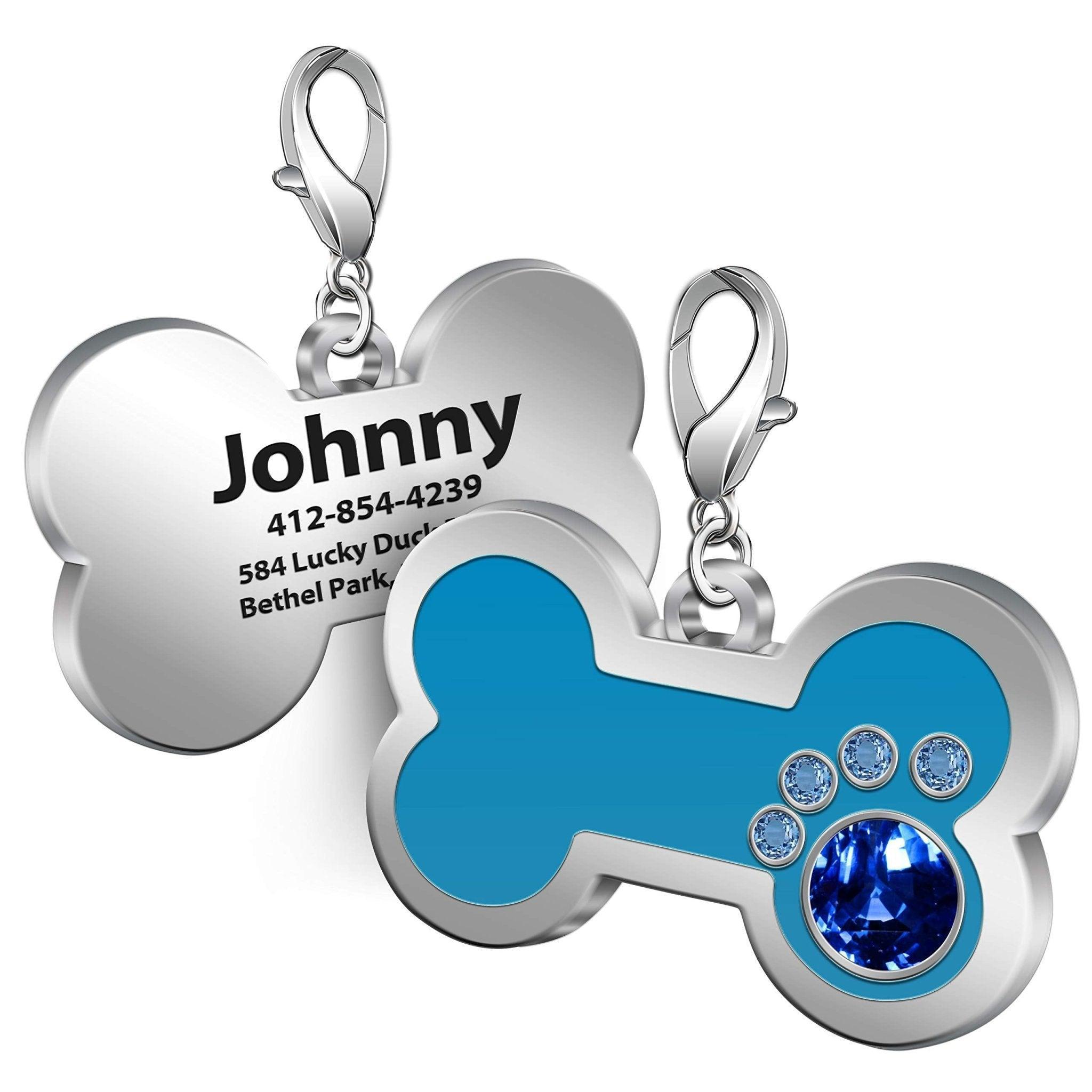 - Design: Bone – shaped with a paw – print motif made of gemstones
