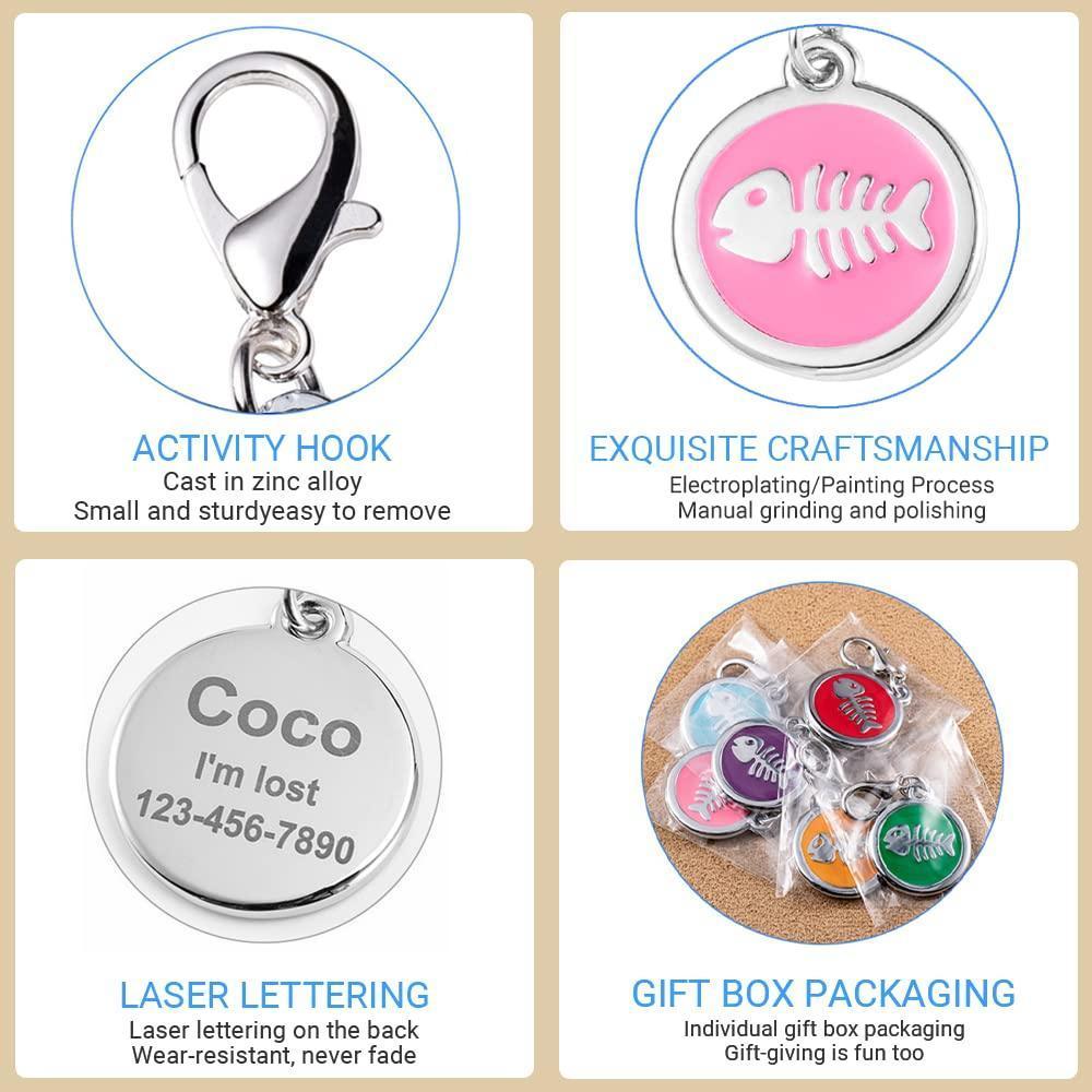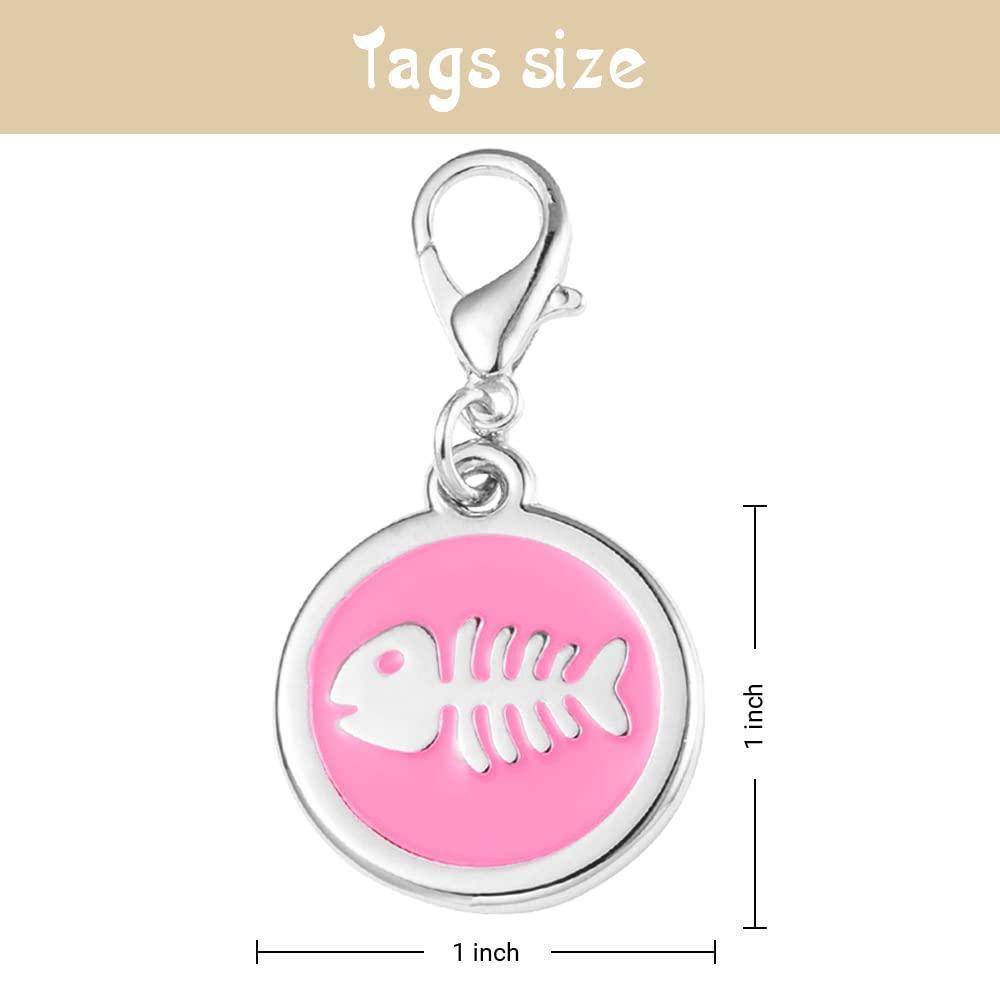 - Design: Circular charm with a raised white fishbone silhouette on a colored enamel background, a silver – toned activity hook, and a flat engraved back