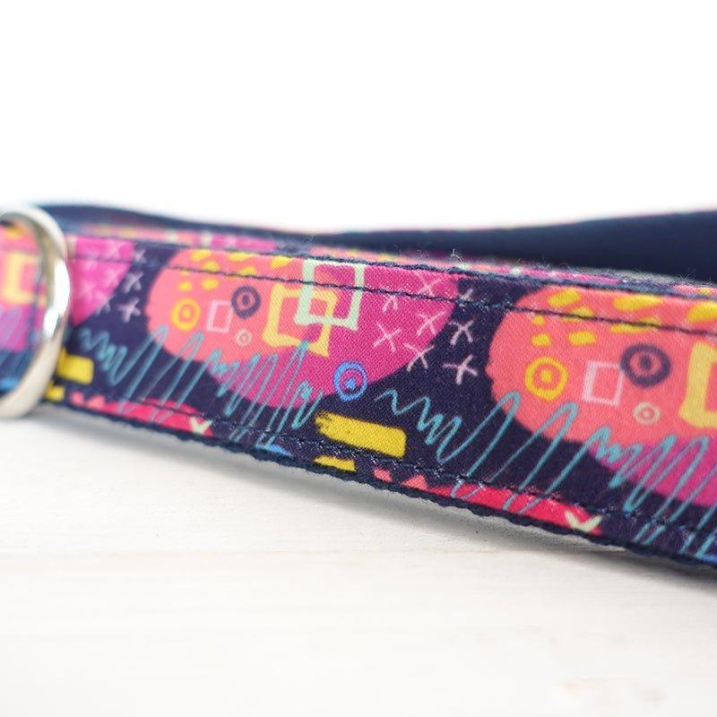 - Design: Vibrant abstract printed pattern on a navy blue base, with bright pink, yellow, blue, and purple shapes