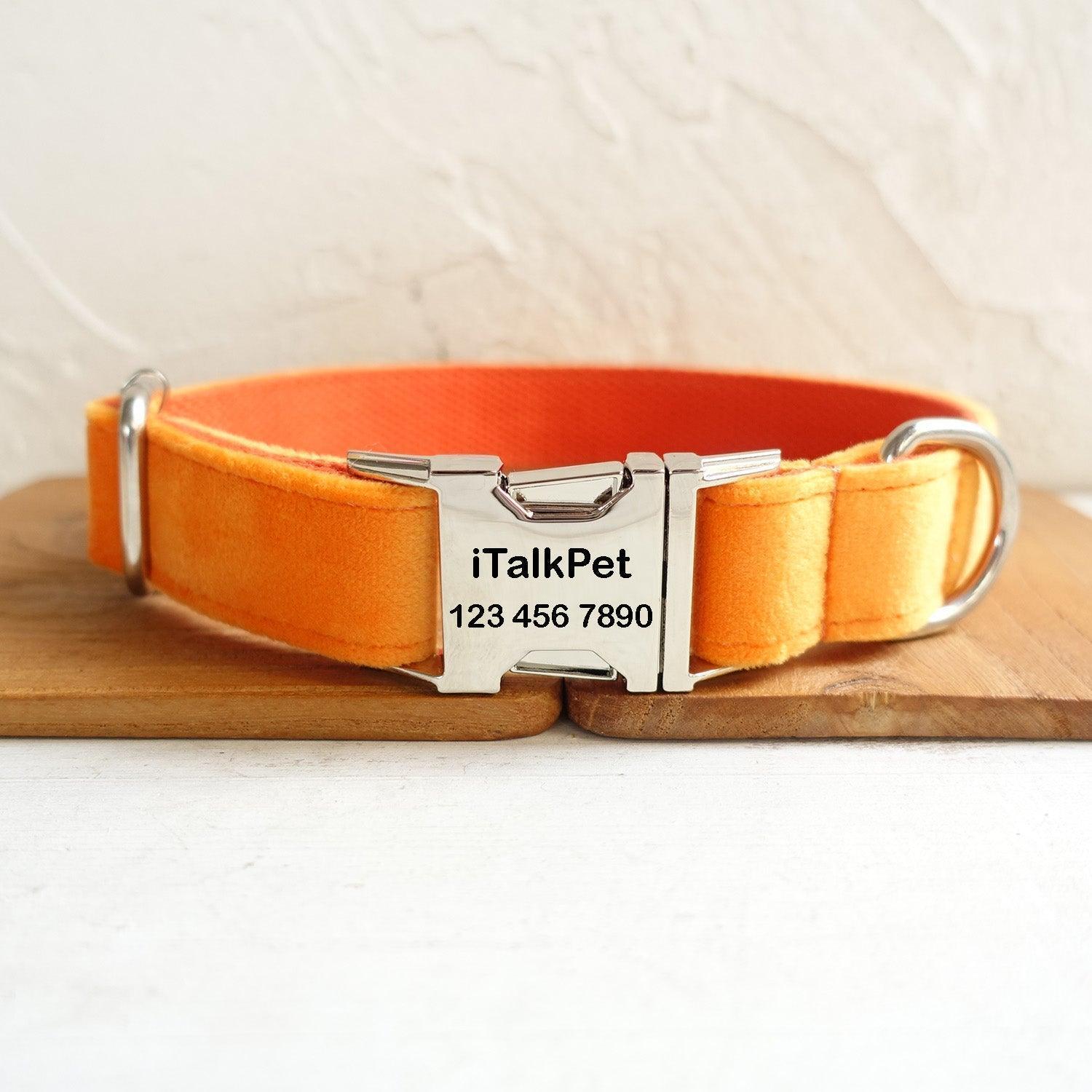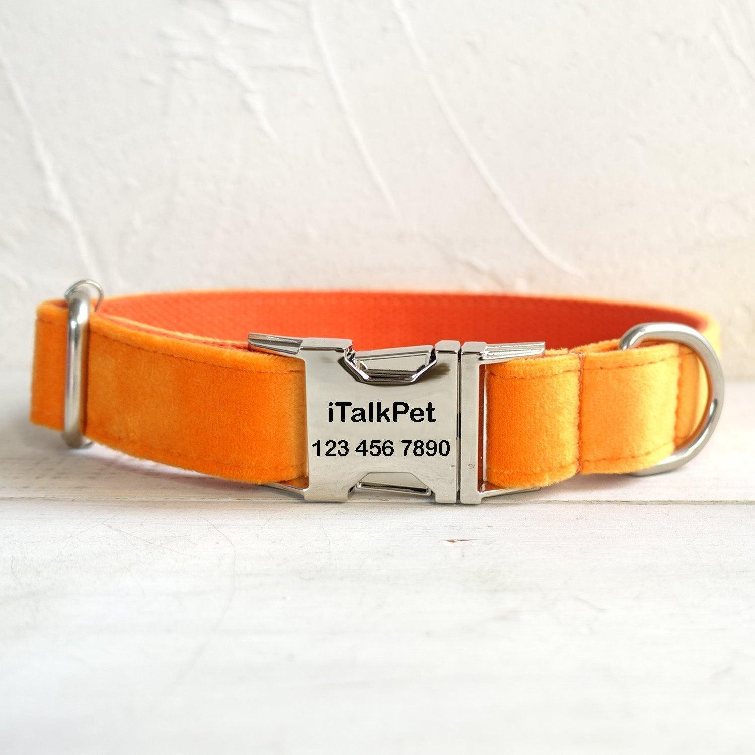 - Material: Outer layer is soft, durable velvet (likely polyester or cotton blend), inner collar is smooth, breathable webbing (nylon/polyester), and hardware is polished metal (chrome/silver)
